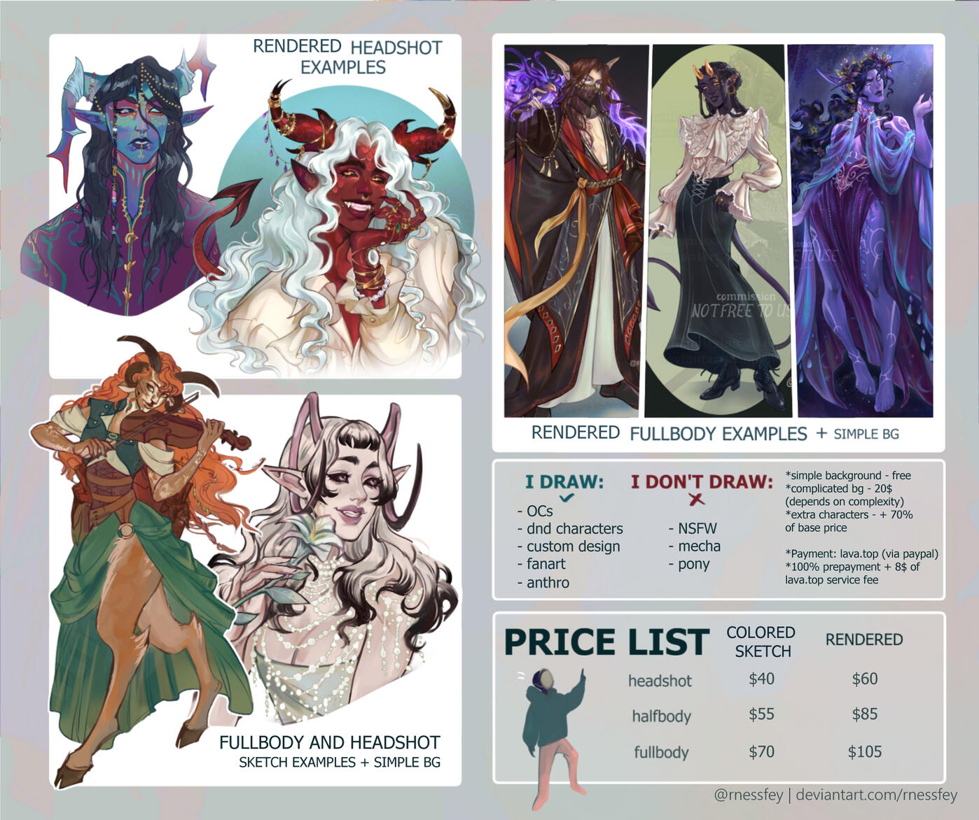 TIMEFRAME/WAITING TIME:- Commissions can take from 2 weeks up to 2 months after payment, unless a different time limit has been discussed personally with the customer.How to order a commission:Email me via [email protected]Please send as many references and details as possible about what you’d like for your commission: art, character design sheet, written descriptions, mood, setting, or pose are perfectly acceptable and recommended.After that I accept your request, full commission price is paid to me and I move on to sending you a sketch (or multiple, if it's custom outfit design, work on sketch takes usually ~ 2 weeks!), upon which you will provide feedback. At this stage, you can make big edits like composition, pose etc.When the artwork is finished, further revisions are limited, high number of edits (up to 5) cost extra (up to 10% of commission full price)The artwork as a high resolution digital file (JPG, PNG) is turned over to you via email, Google Drive or whichever method the client prefers.ARTWORK USAGE:I have full rights over my artwork, including the right to post the artwork on other sites for portfolio purposes. You are not permitted to sell it, edit or claim credit.I don't allow the use of my art for training AI/ML models.You may use the image for non-commercial purposes (posting the finished artwork in your profiles, using it as an icon of your profile, print it for private use).But please credit me, I'll be very greatful!Commercial use might be charged 2 times the original price.Looking forward to working with you! If you have any questions, please contact me:
